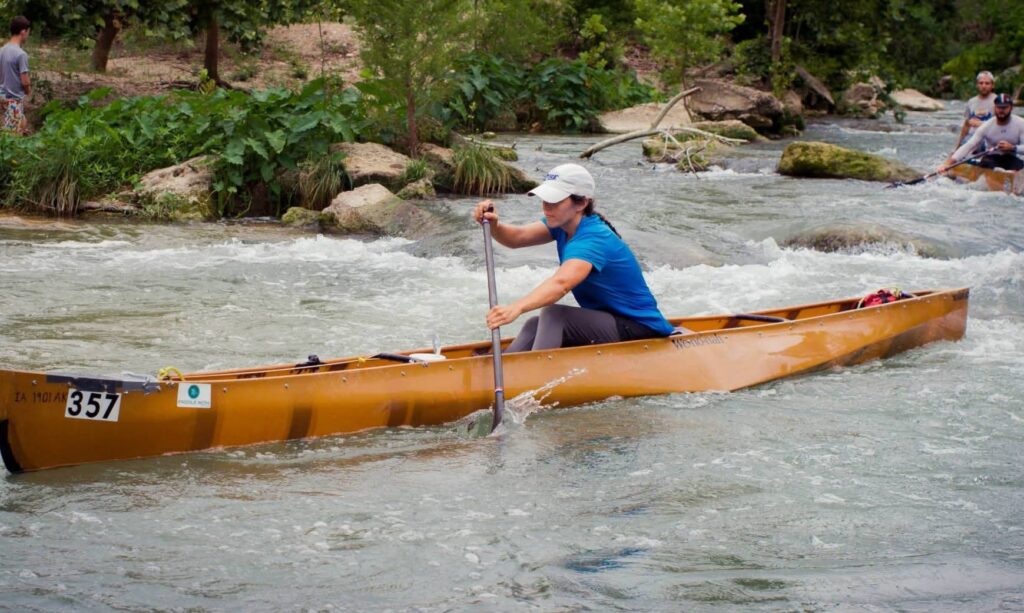 Maximum length 18’6″, minimum width 14 3/8% of length at the 4″ waterline. Minimum bow height 15.5″, minimum stern height 11.5″, depth at center 11.5″. Limited to one female entrant with single blade paddles (no rudders).